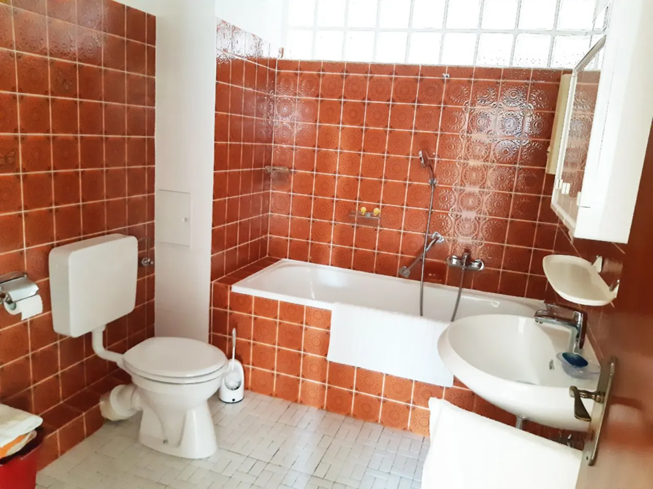 gefliestes Badezimmer mit Wannenbad, WC, Waschbecken und Waschmaschinenanschluss